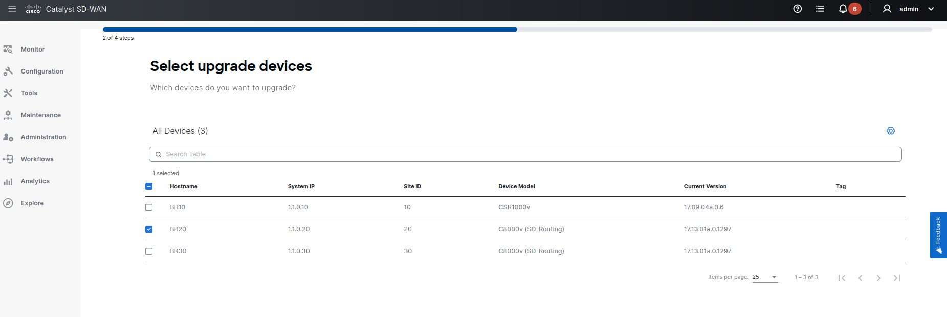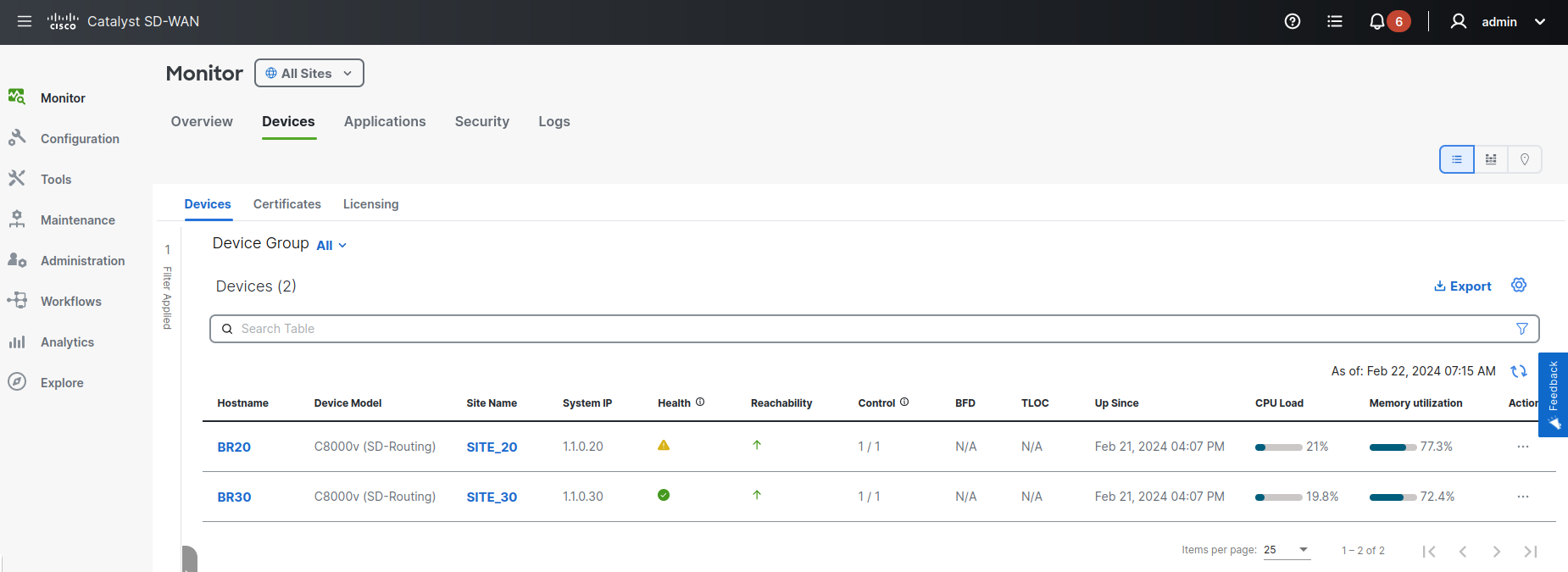 If we want to see more detailed device information we can visit the Devices tab. SD-WAN Manager is constantly refreshing this information so we have an accurate view. Notice devices are listed as SD-Routing.