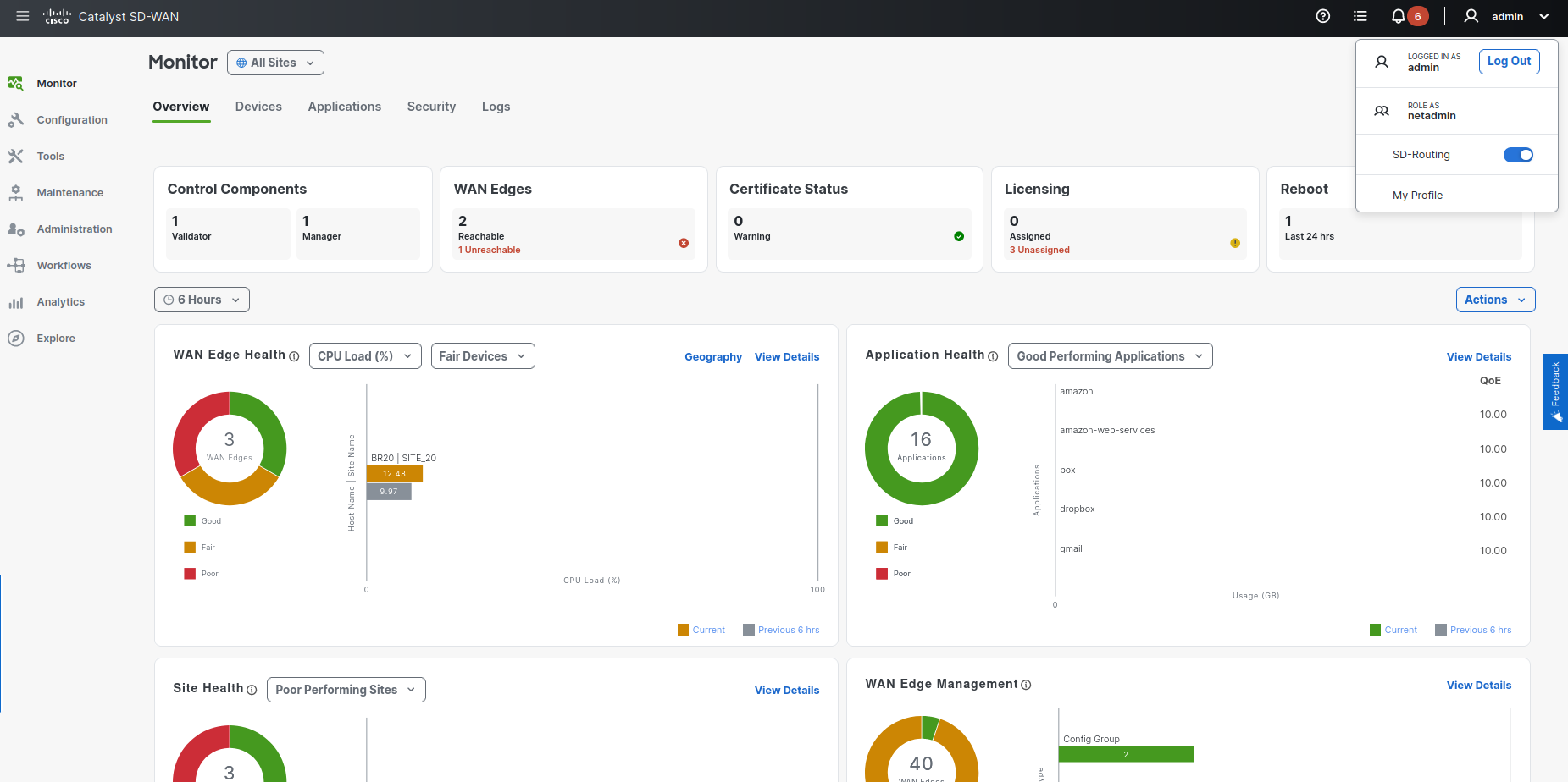 The Magnetic look and feel will remind you of other Cisco Security Products or Meraki Dashboard, this is great to keep the experience consistent. Notice top right there is a SD-Routing toggle button, this is very useful to show the information concerning SD-Routing and the reason why we don’t see the SD-WAN Controller.