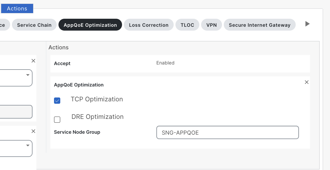Next, I create a simple data policy matching traffic between client and server and select the action to be AppQoE Optimization and check the box of TCP Optimization.