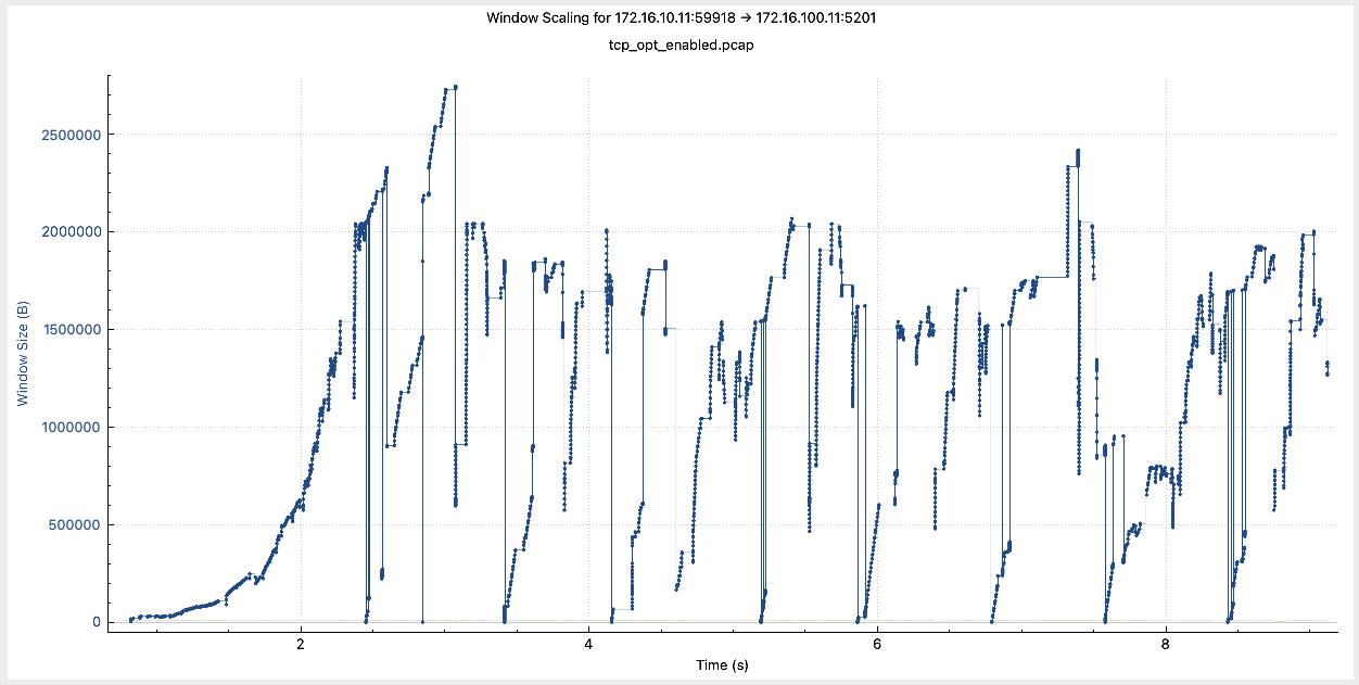 Notice that the window size remained mostly stable at around 1,000,000 Bytes after around 5 seconds