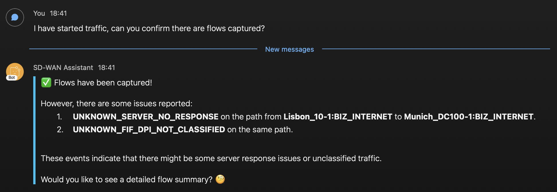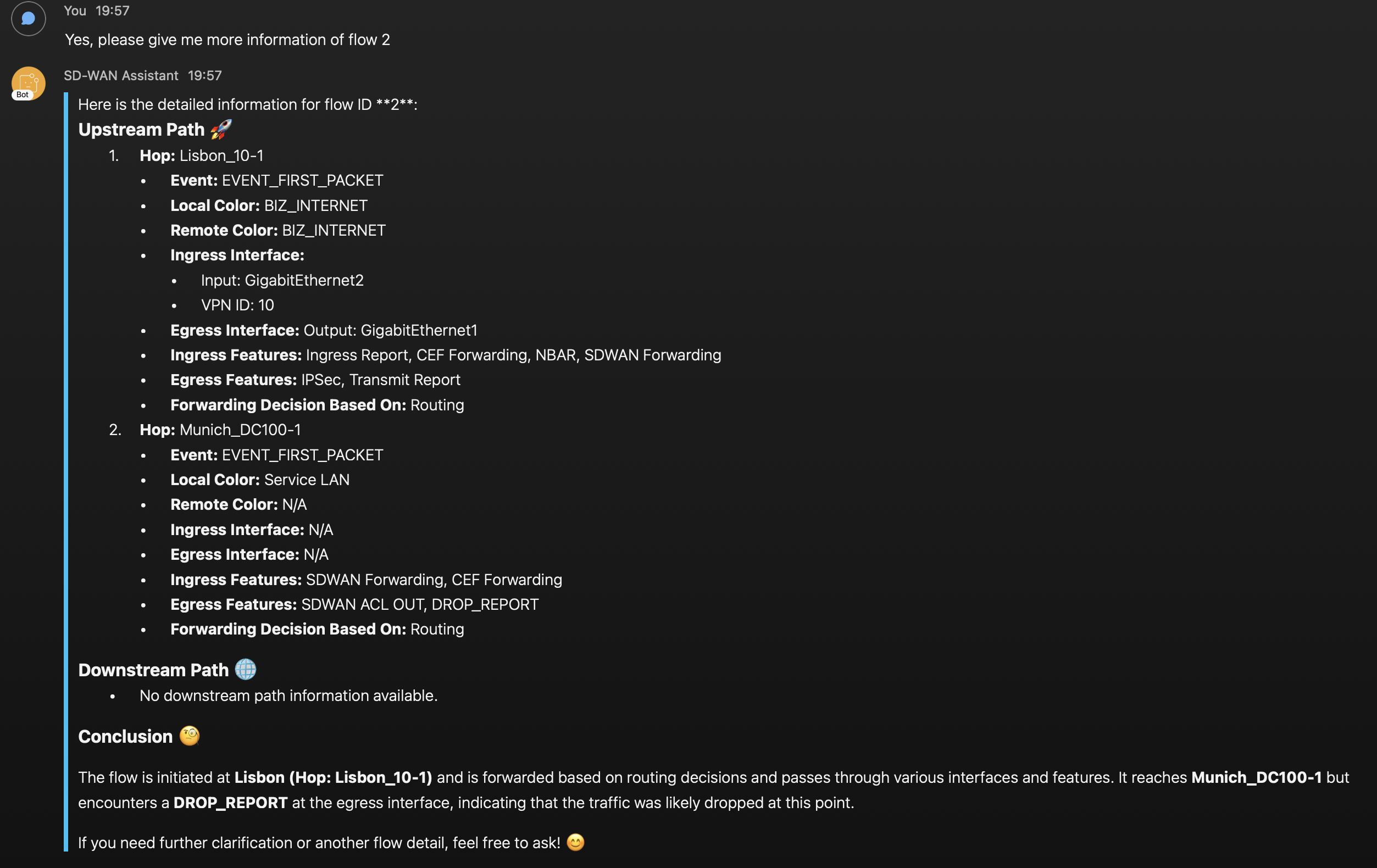 Finally, the assistant provides detailed information about the features that each of the hops apply to the traffic. On the second hop in Munich DC we can see that egress features show the SD-WAN ACL and a Drop Report. The assistant provides its own conclusion and it is also suspecting that Munich router is dropping the traffic. With a little bit more work, the agent could be able to tell the name of the ACL and sequence number that is dropping the traffic. We have successfully identified the root of the issue!! 😀 🎉