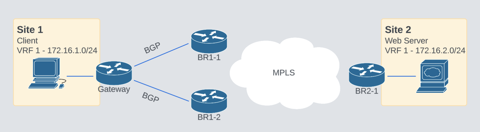 At a routing level, the Gateway router has two available entries to reach the web server, both equal and coming from BGP. With the current configuration, the Gateway picks BR1-1 as primary and BR1-2 will remain as backup.