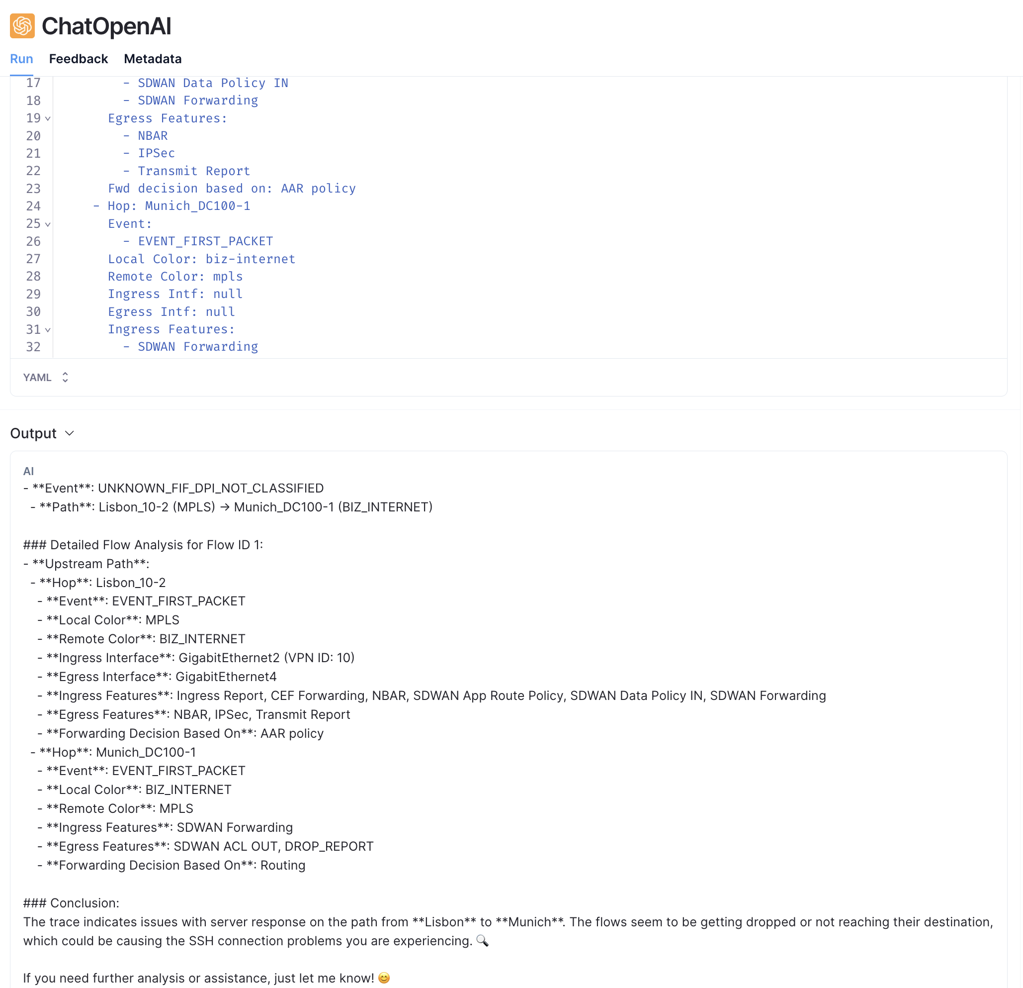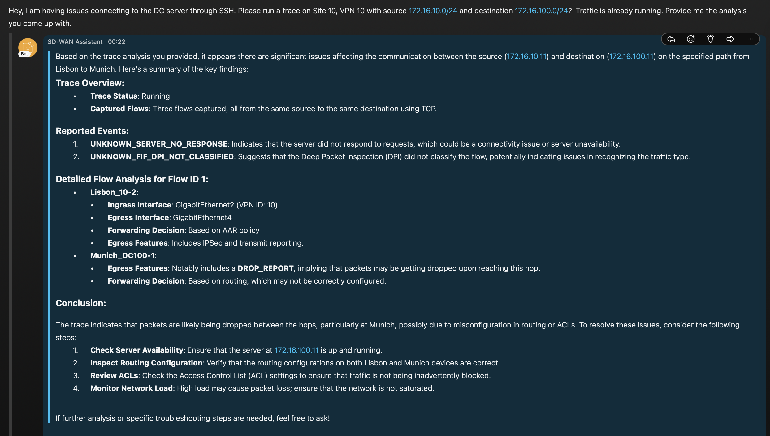 The response presents information in a condensed way, indicating the hops and path the traffic is taking and some events detected for this communication. The details of one of the flows is also present, however is has less information than before. This is because I have asked the reviewer agent to keep what it considers more relevant and send it to the user. In the end, we can see that the DROP_REPORT is mentioned and there is a suggestion to review ACLs 🎉