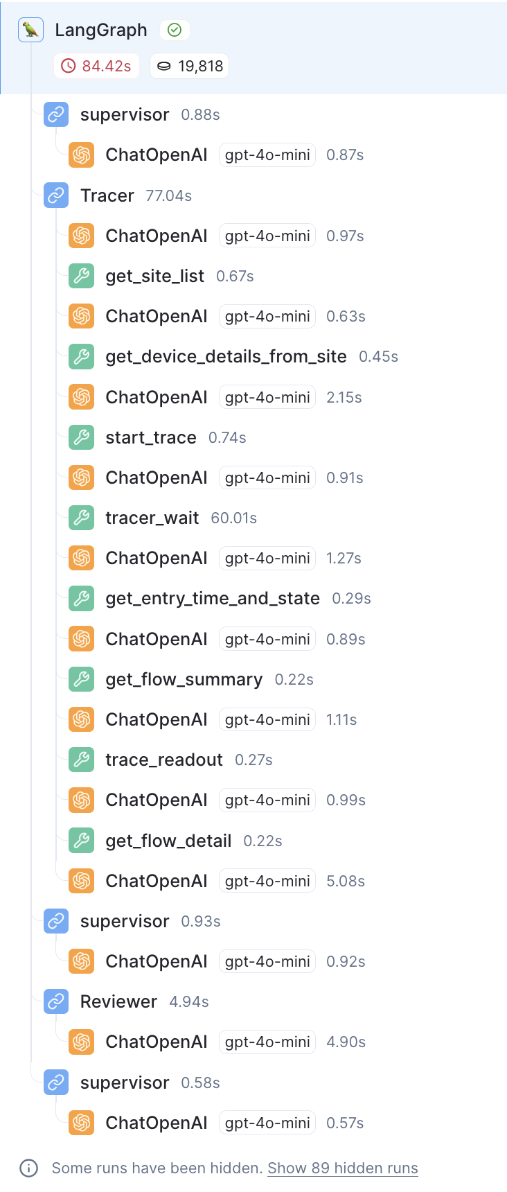 Next, the tracer uses the available tools to starts the trace, waits to capture some flows and retrieves information. Reports to the supervisor. Note that the order in which tools are executed is up to the agent.