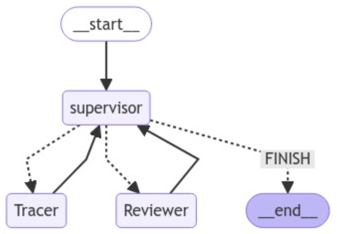 The continuous arrow indicate the next step that must be taken. For example, after “start” the next agent must be the supervisor. Tracer and Reviewer must go to the supervisor.