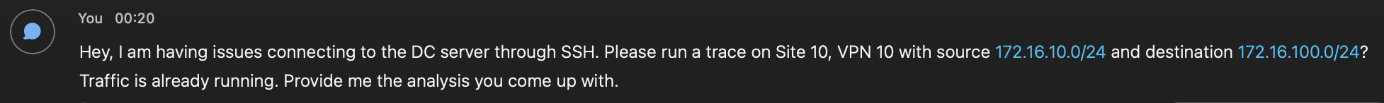 I tell the assistant information about the issue and inform that there is traffic passing already (traffic is required in order for NWPI to generate the insights we are looking for).
