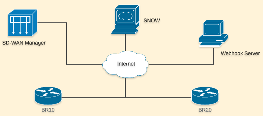 En nuestro escenario, el SD-WAN Manager monitoreará eventos en BR10 y enviará solicitudes HTTP POST a nuestro servidor de Webhook cuando ocurran eventos específicos. Esto nos permitirá gestionar los incidentes en ServiceNow.