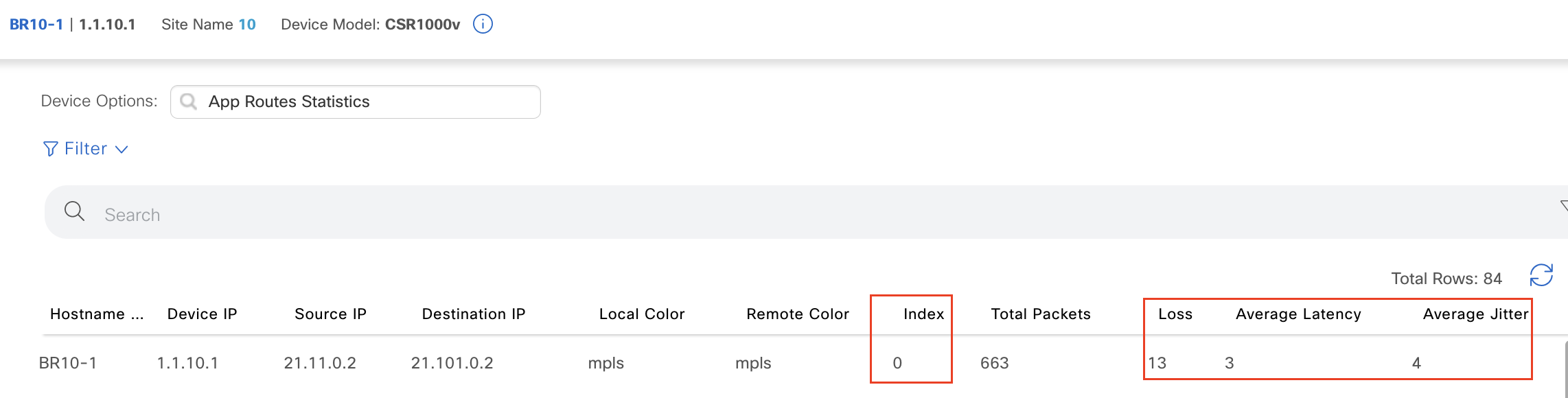 La pérdida promedio, la latencia y el jitter, se calcularán para cada poll interval. Podemos verificar esto directamente en SD-WAN Manager -> Monitor -> Real Time -> App Route Statistics