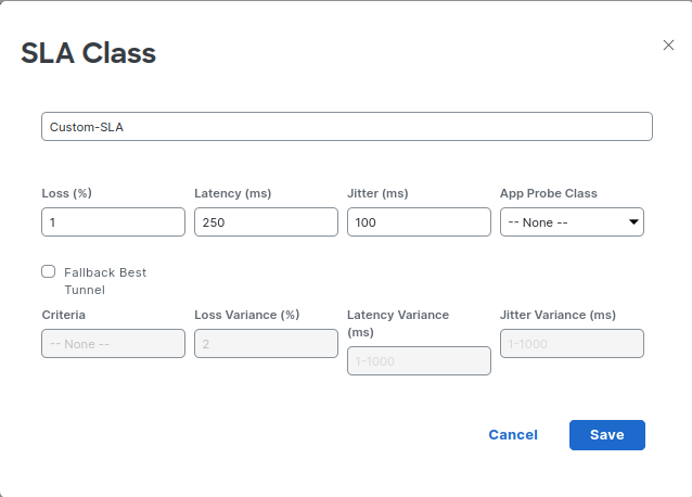 Puedes utilizar los datos históricos de KPIs en SD-WAN Manager para construir una línea base y definir un SLA adecuado.