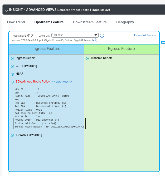 Como se esperaba, ahora el tráfico se está tirando en BR10, ya que no hay transportes que coincidan con el SLA. Nota como DROP_REPORT indica SdwanDataPolicyDrop
